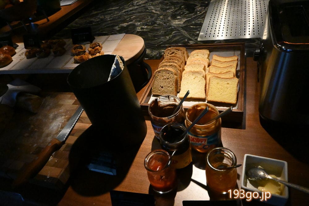キッチン側のカウンターには、カリカリベーコンや卵料理、ほうれん草のソテーや豆類を取り入れた出来立ての料理に、ご飯に合うおかずや味噌汁などの和食、スープ、パン、ジャムやハチミツ、シリアルなどが並ぶ。
