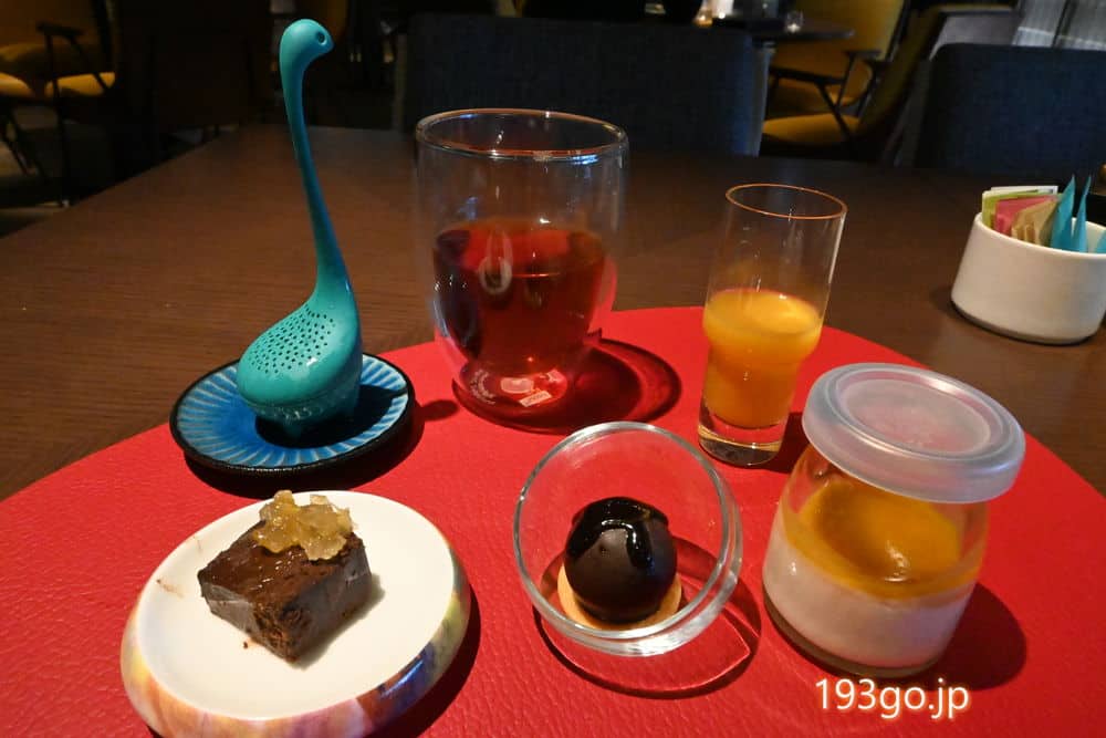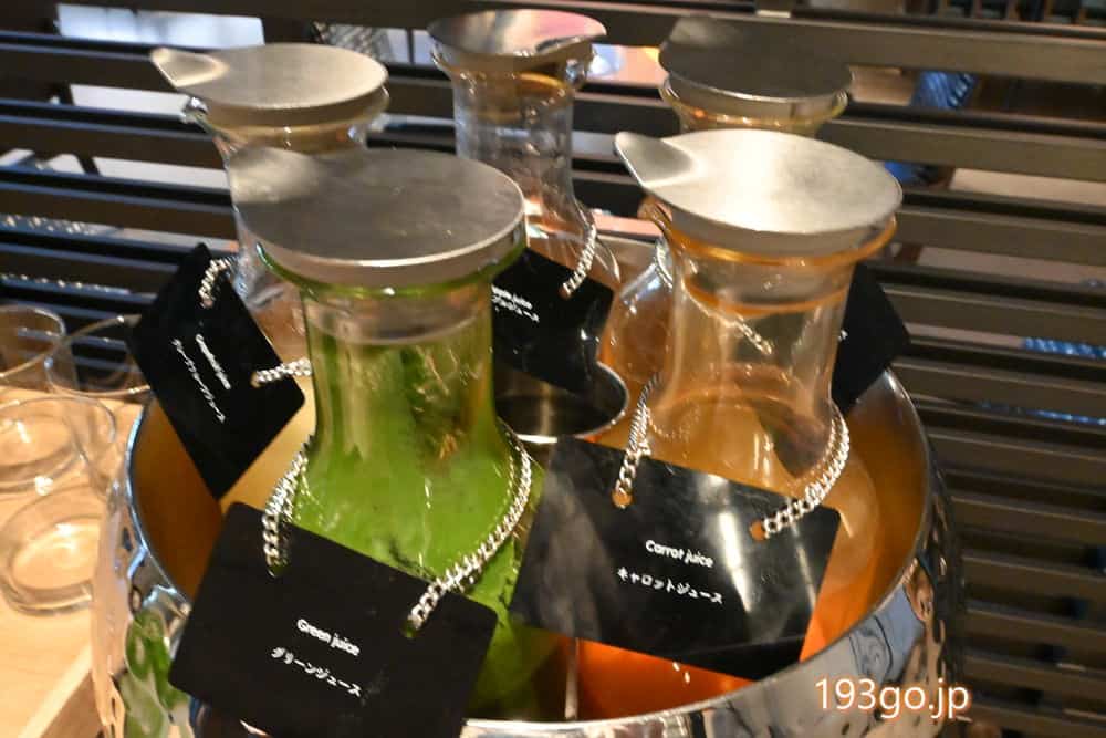 ドリンクは、ビュッフェ台の冷えたジュース類以外に、カフェラテやオリジナルブレンド、温かいティーなどがテーブルで注文でき、お替り自由だった。