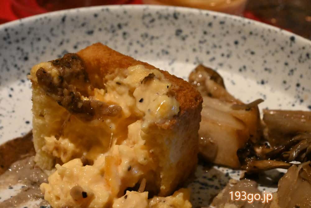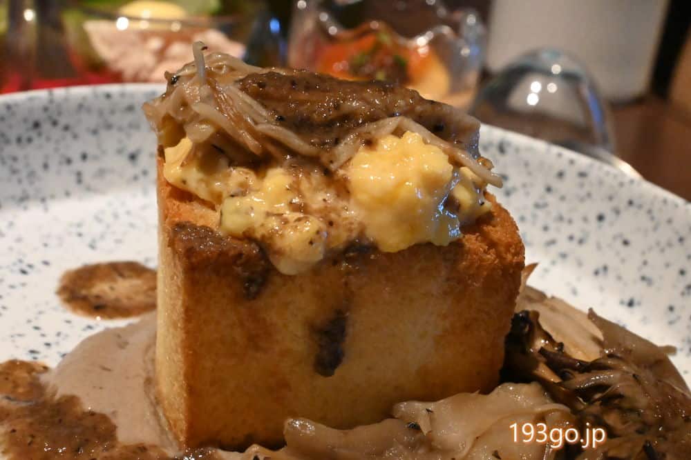 キューブ型のこんがりしたトーストに、スクランブルエッグやキノコのソテーが無造作に盛り付けられたもの!ポルチーニ茸やトリュフ香る、初のスタイルの料理は、ボリュームも満点。