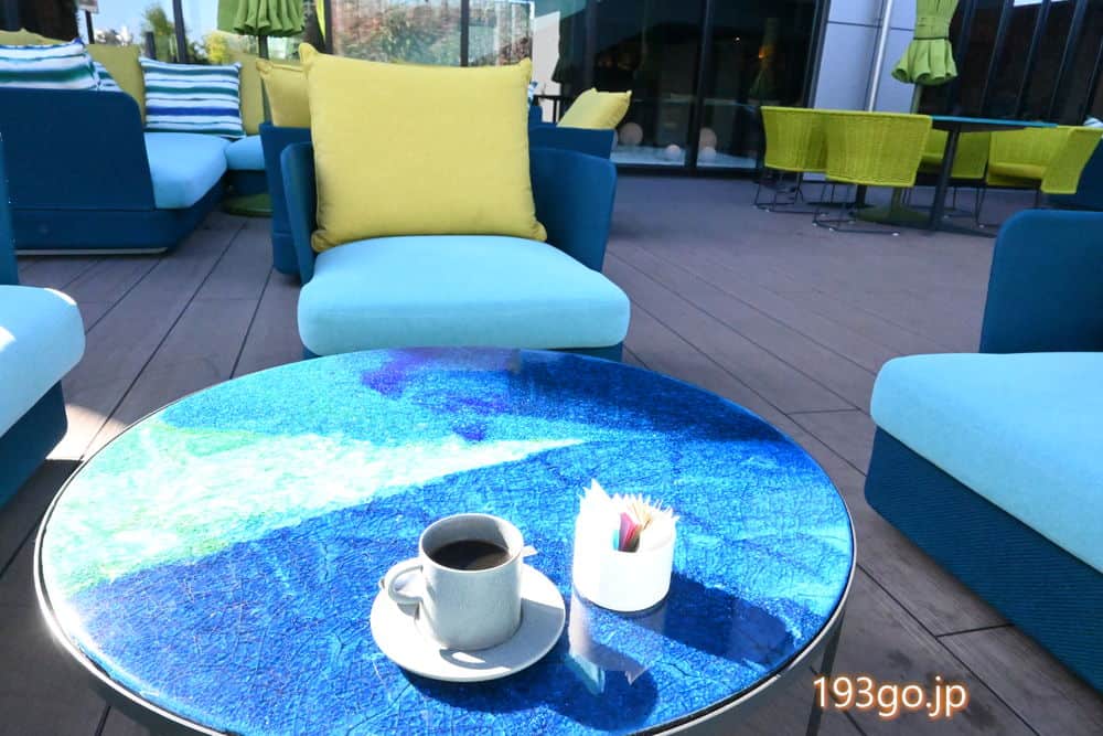 地中海の海を思わせるブルーのテーブル&ソファーで、一息。