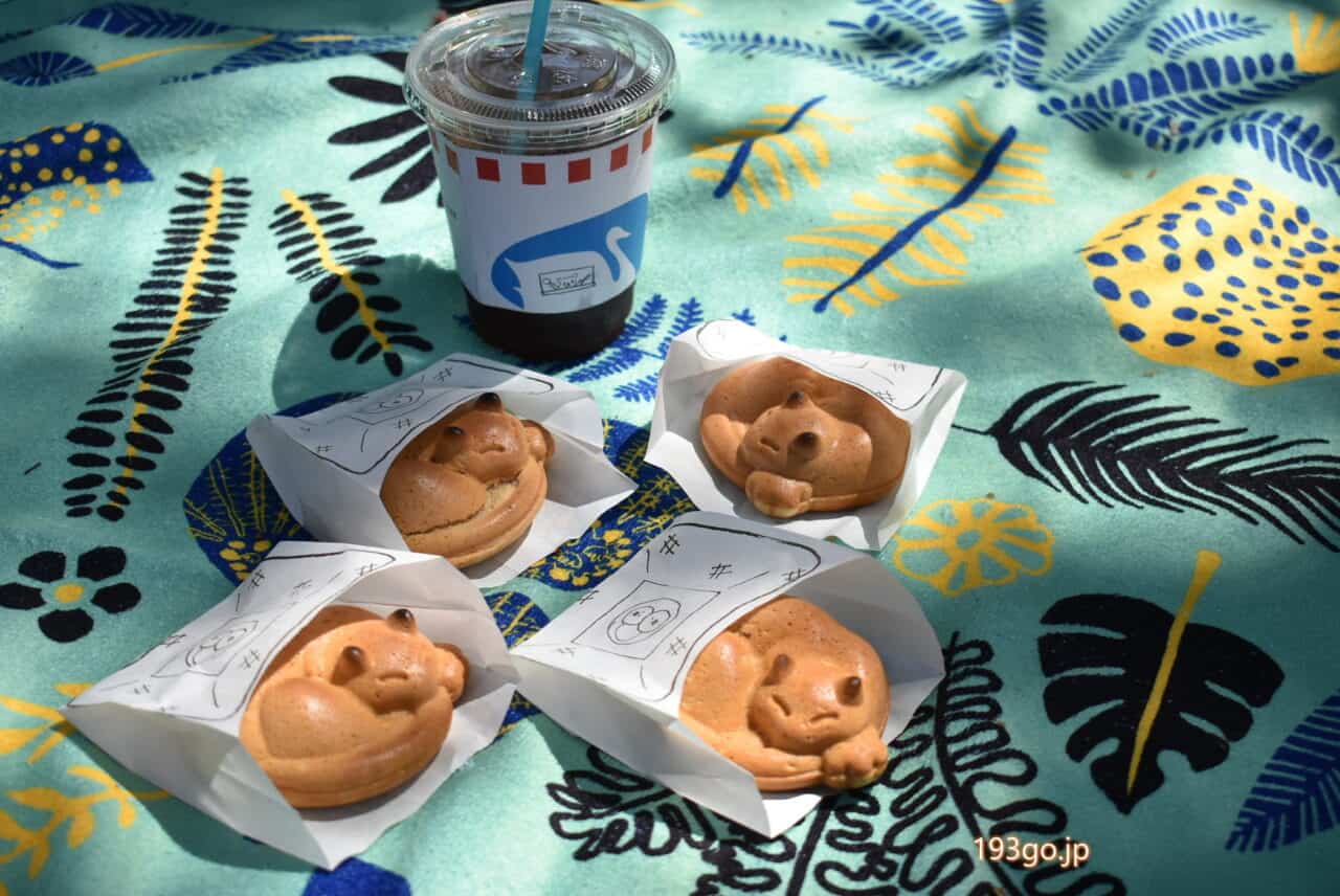 スワンボートをモチーフにしたカップ、名物ねこドーナツも