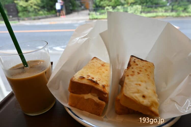 モーニングセットのクロックムッシュとアイスカフェラテ。