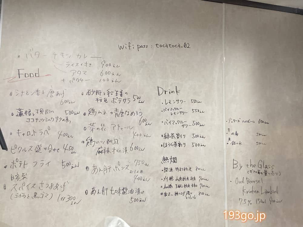 店内の壁に手書きメニューが。カレー、シナモン香る唐揚げ、自家製スパイスさつま揚げ、砂肝と紅しょうがの桜色ポテサラ、菜の花アチャール…店主がスパイス好きとのことでスパイスを取り入れたおつまみが揃う!どれも美味しそう。