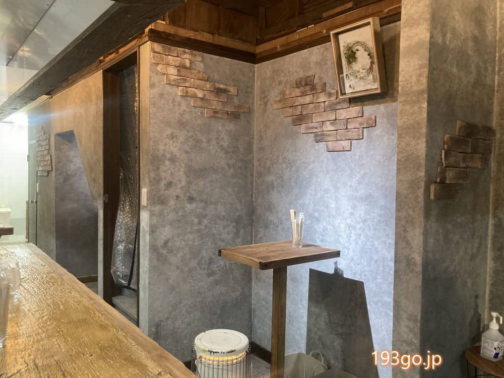 店内はカウンターのみで打ちっぱなし風の壁に、レンガを取り入れたお洒落な雰囲気。階段下の席もいいね。