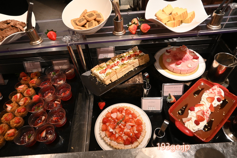 デザートは、旬の苺をメインにした鮮やかなスイーツが並ぶ。