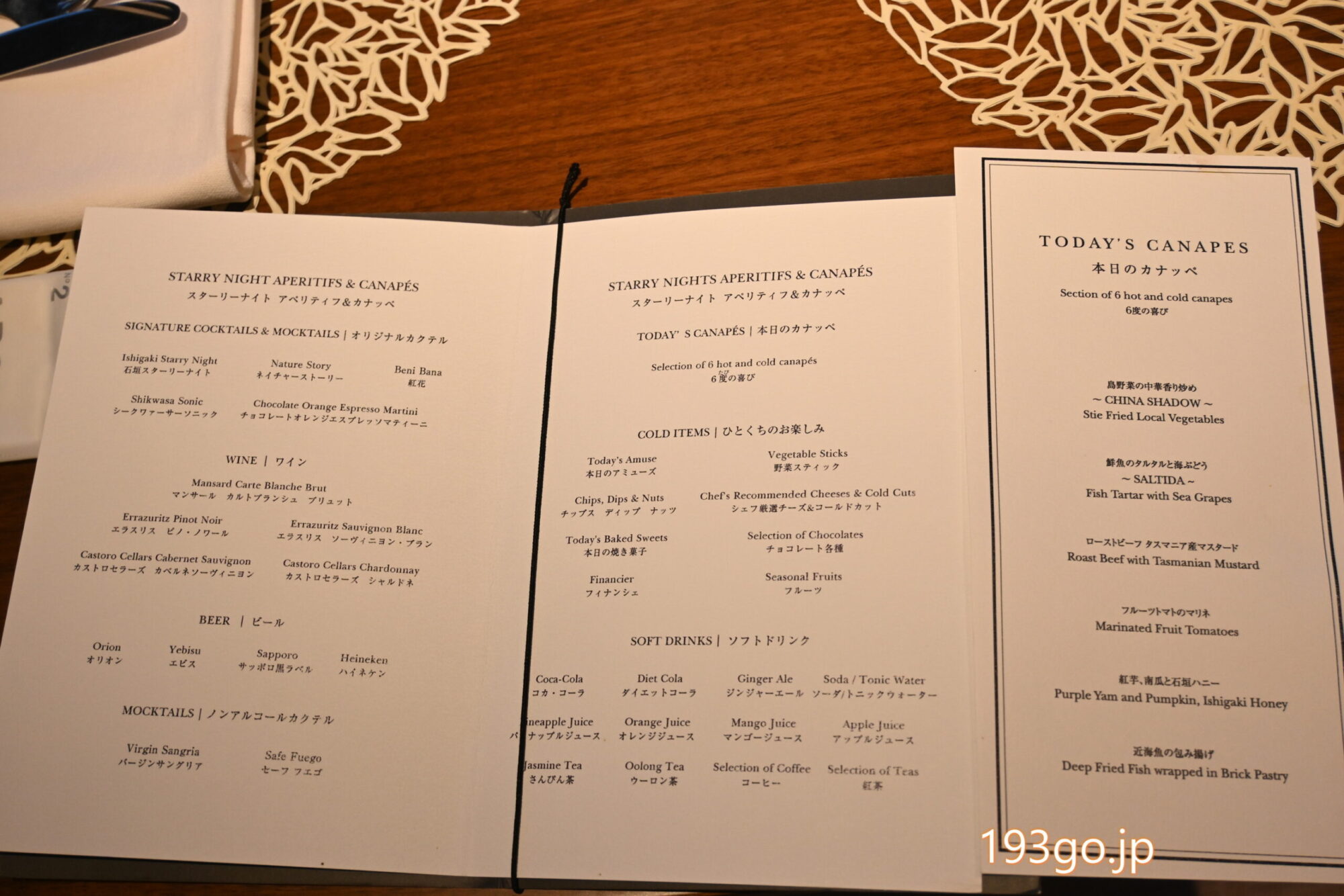 ドリンクは、シャンパンやワインだけでなく、オリジナルカクテルやモクテルの種類が多いも嬉しい。クラブインターコンチネンタルが開業した七夕にちなんだシグニチャーカクテル「石垣スターリーナイト」や、パイナップルやマンゴーをはじめとする南国フルーツとハイビスカスなどのハーブを使ったオリジナルドリンク。