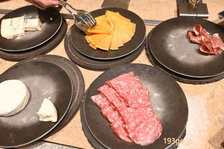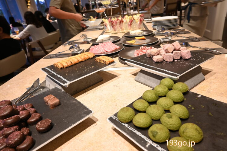 17:30〜19:30のカクテルタイムには、シャンパン、ワイン、ビールなどのアルコールの提供と、ビュッフェ台に、ハムやチーズ、ナチョス、フルーツに焼き菓子、チョコレートなどが並び、更にテーブルではシェフ特製カナッペがサーブされた。