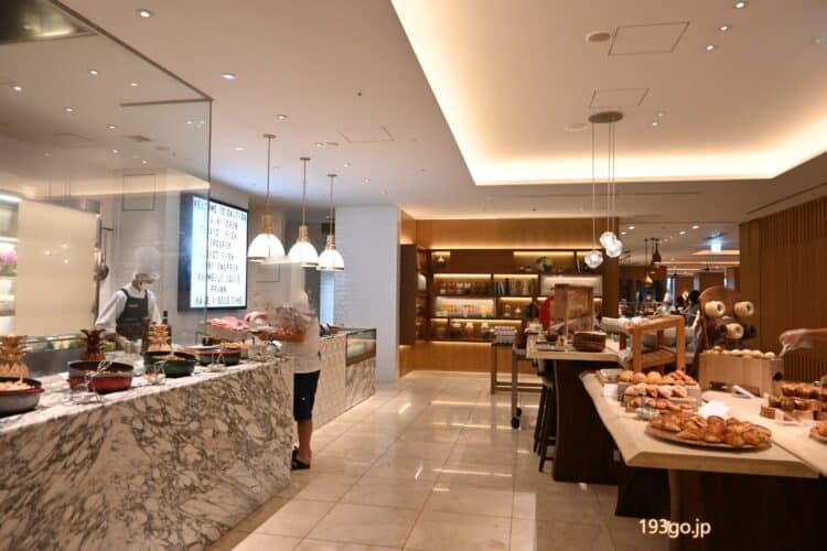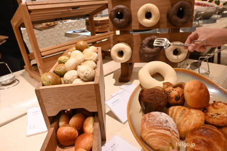 ドーナツ型ベーグルもお洒落にレイアウト。食パンは種類別に。