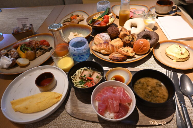早朝はお客さんが少なく、ビュッフェ台に料理がぎっしり陳列。