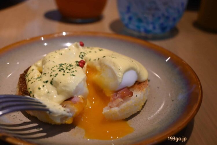 始めにテーブルでサーブされる卵料理と、コーヒーor紅茶のオーダーを聞かれる。卵料理は、エッグベネディクト、スクランブルエッグ、オムレツなどからチョイスでき、エッグベネディクトを。