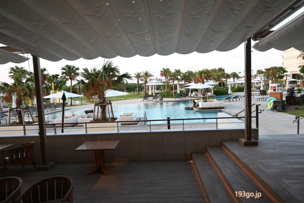 窓辺のソファー席で。ヤシの木やガーデンプールが見渡せリゾート感たっぷり。