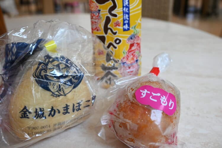八重山離島の玄関口「ユーグレナ石垣島離島ターミナル」には様々な売店があり、名物のポークたまごおにぎりや、じゅーしー(沖縄風炊き込みご飯をかまぼこで包んで揚げたもの)などのテイクアウトグルメが販売されていた。