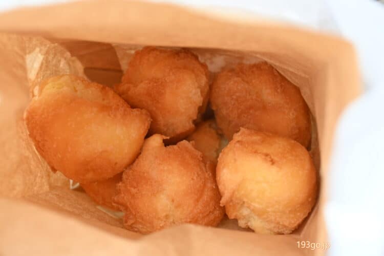 紙袋に入れられたサーターアンダギーを早速食べてみると、手に持っていられないくらいアツアツ。外はサクッと中はホワっ。手作りの素朴な味わい。