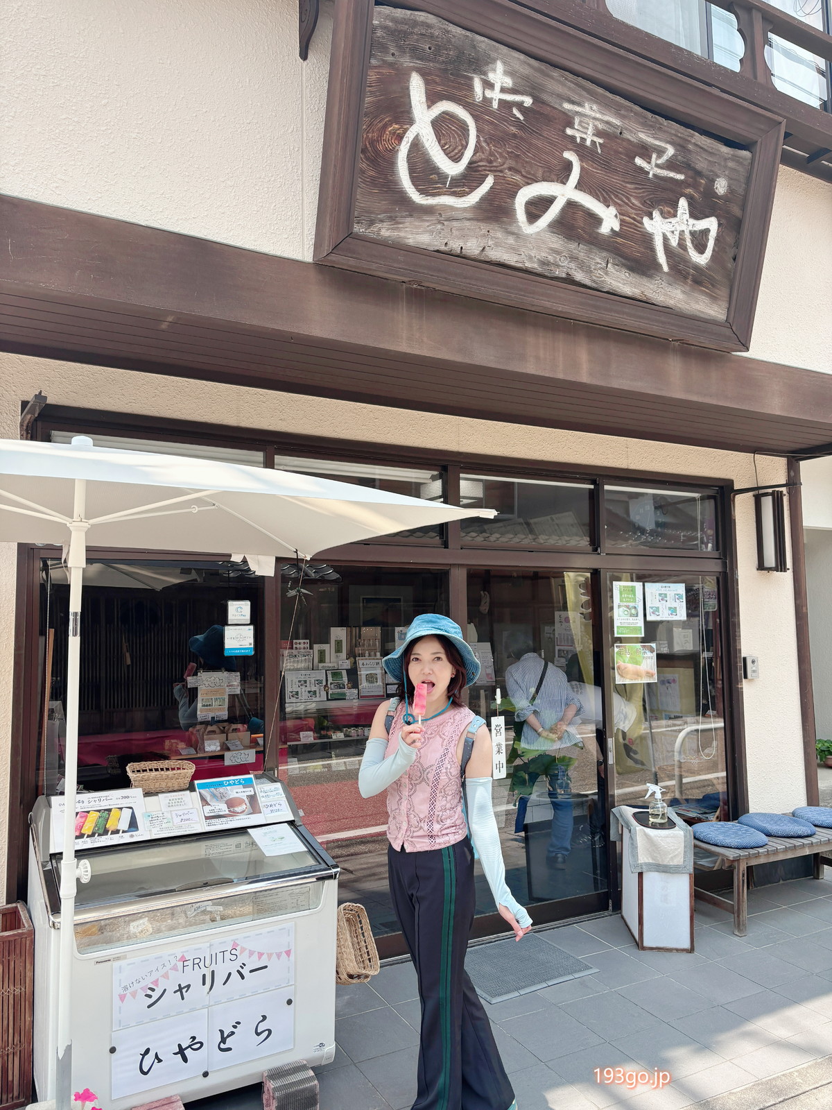 食後は、向かいの甘味屋「とみや」で葛アイス。5フレーバーから出雲のいちごに!