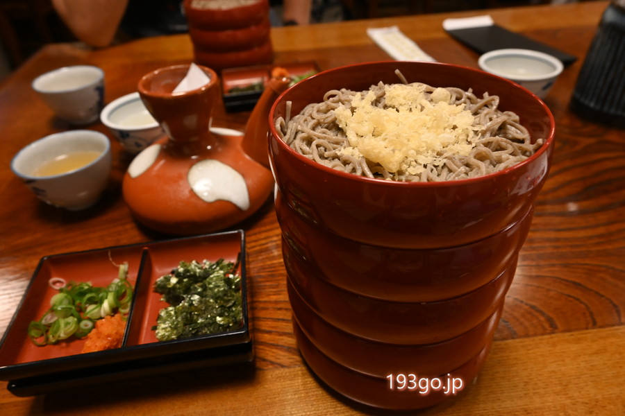 一段ずつめん汁をのの字にかけて、薬味も加えて、食べ終わったお椀を下に重ねて次の段へ。
