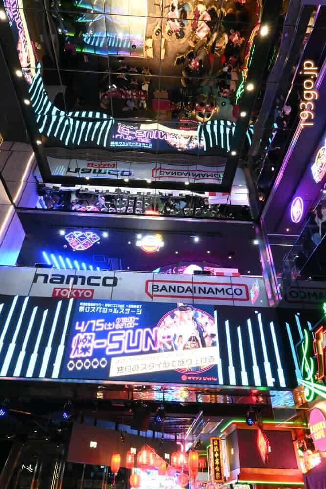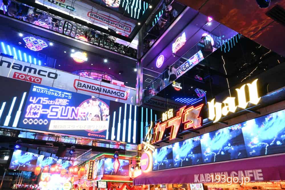 特に2階の「新宿カブキhall」と3階「namco TOKYO」は、若者と外国人旅行客であふれかえっていた。2フロアは吹き抜け空間で、3階からは2階の様子がうかがえる。2階からも見上げると天井のミラーに映像やネオンが映し出される。