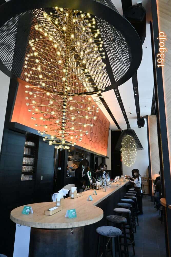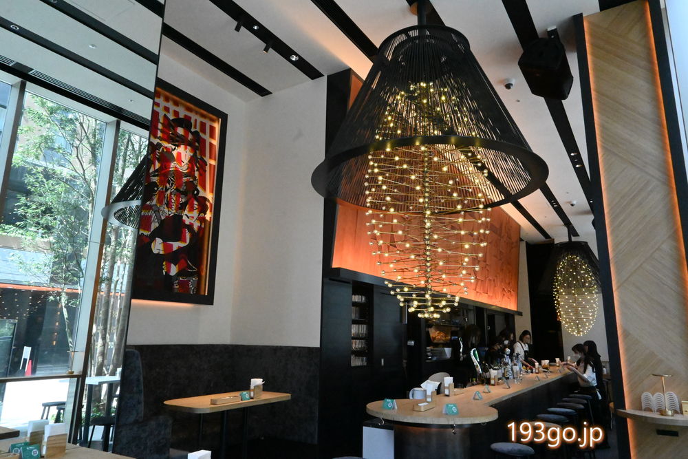 天井が高く、モダンな空間。シャンデリアや壁の歌舞伎のアートもインパクトあり。