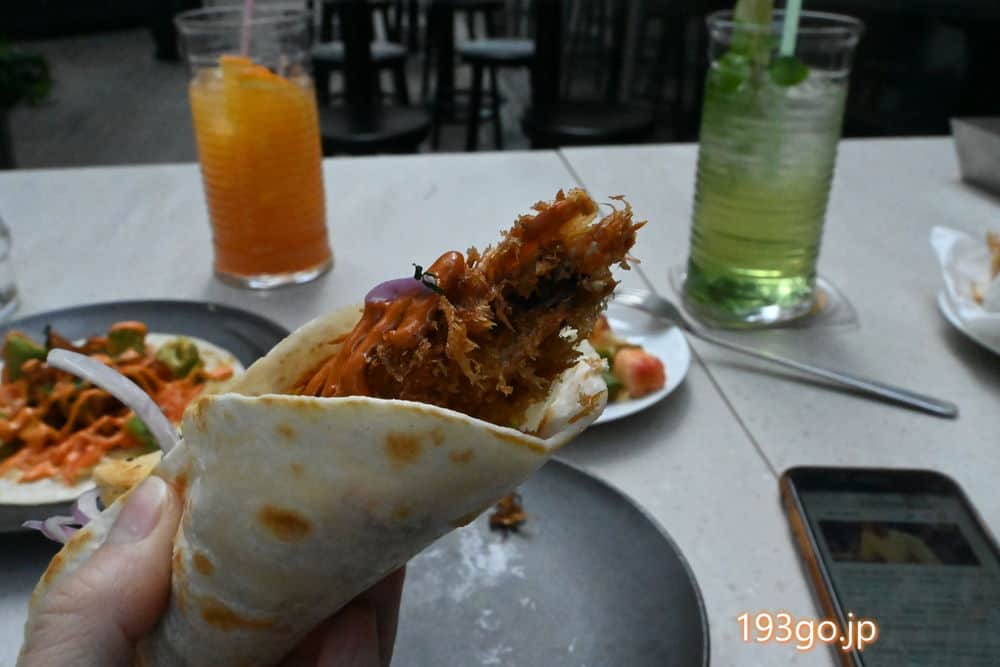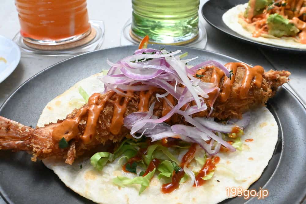 トルティーヤに有頭海老フライが一本乗ったビジュアル映え。海老フライを包んでパクッと、食べやすい!軽やかな衣に、プリフワの海老。シャキシャキ野菜と。