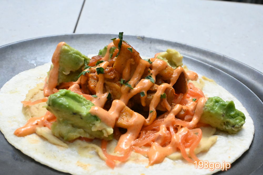 もちもちのトルティーヤに、タンドリーチキンとアボカド。ソースはメキシカンかな。