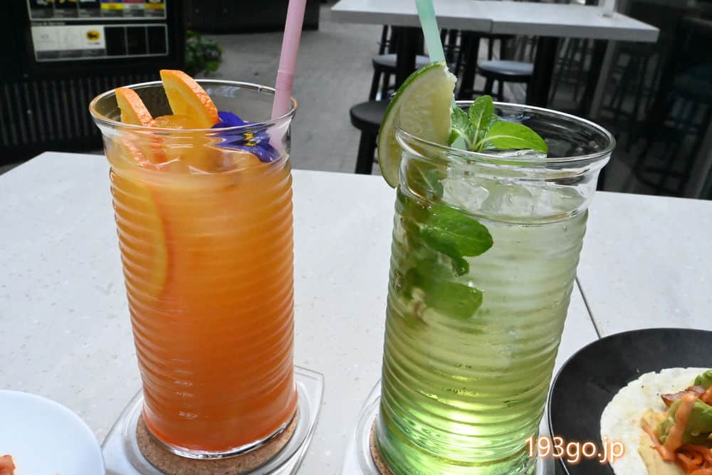 カラフルなドリンクがテーブルに運ばれると、気分も上がるね。フルーツやお花もトッピングされた南国風のノンアルコールカクテル。