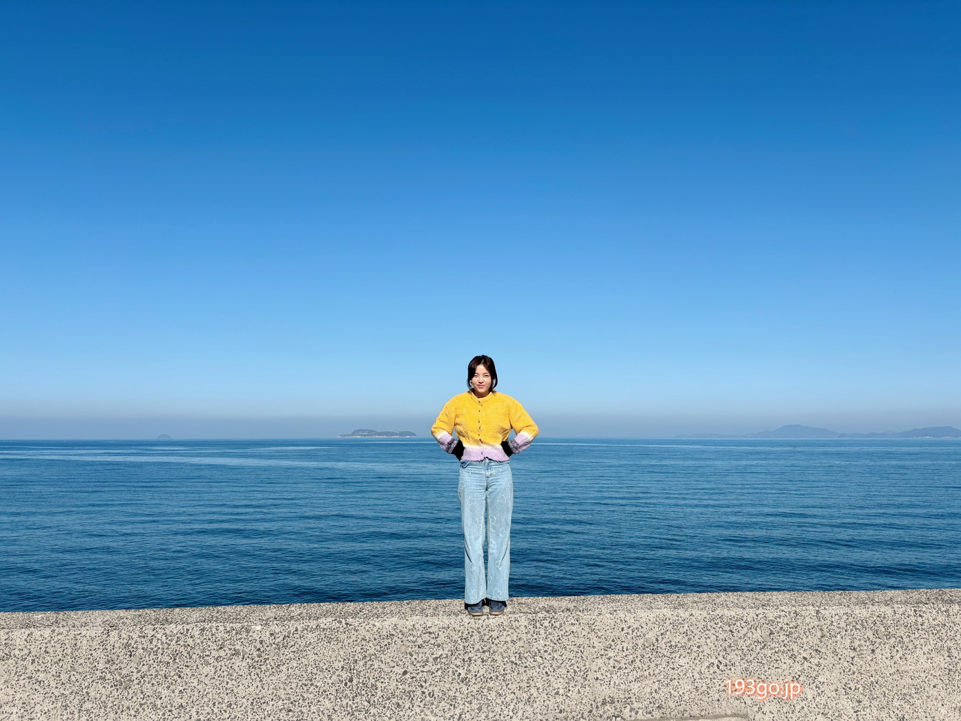 向かいは海~。瀬戸内海の青い海と青空が広がり爽やかな朝。