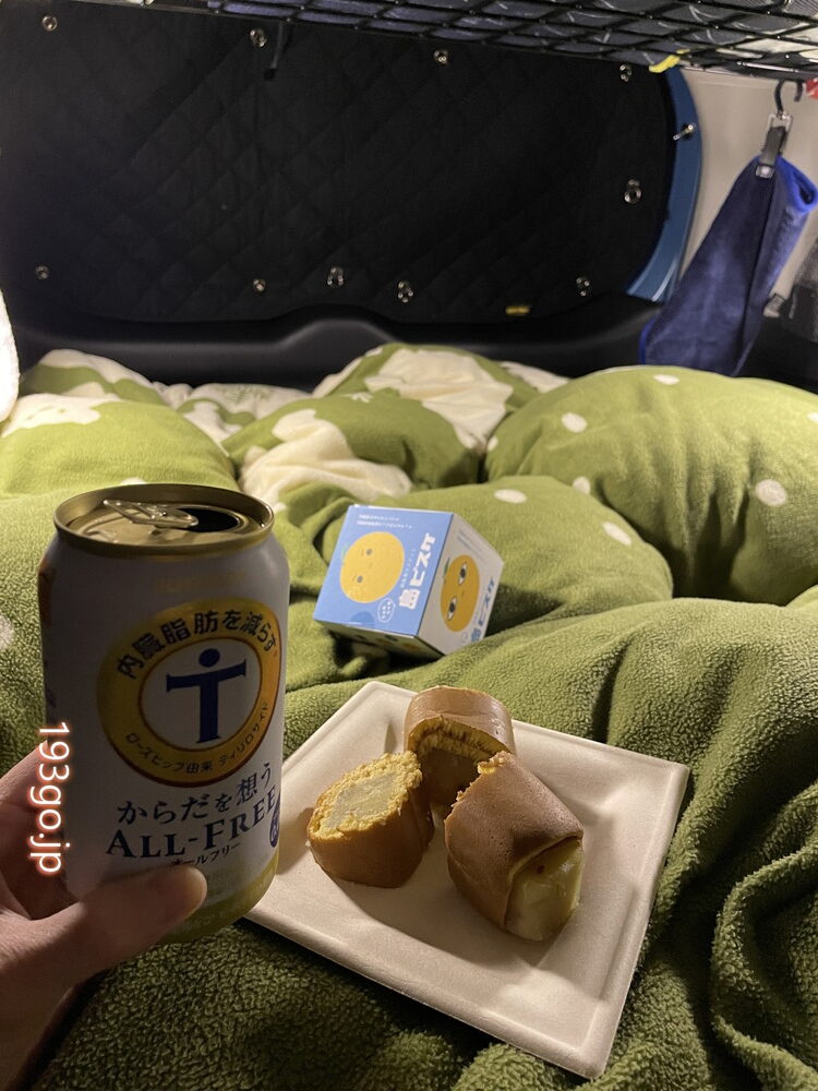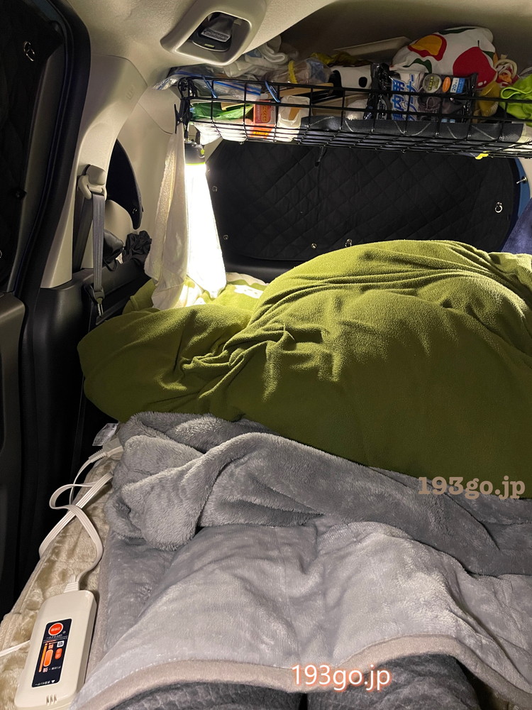 温泉で温まったら、道の駅側の駐車場に移動し、寝る支度。