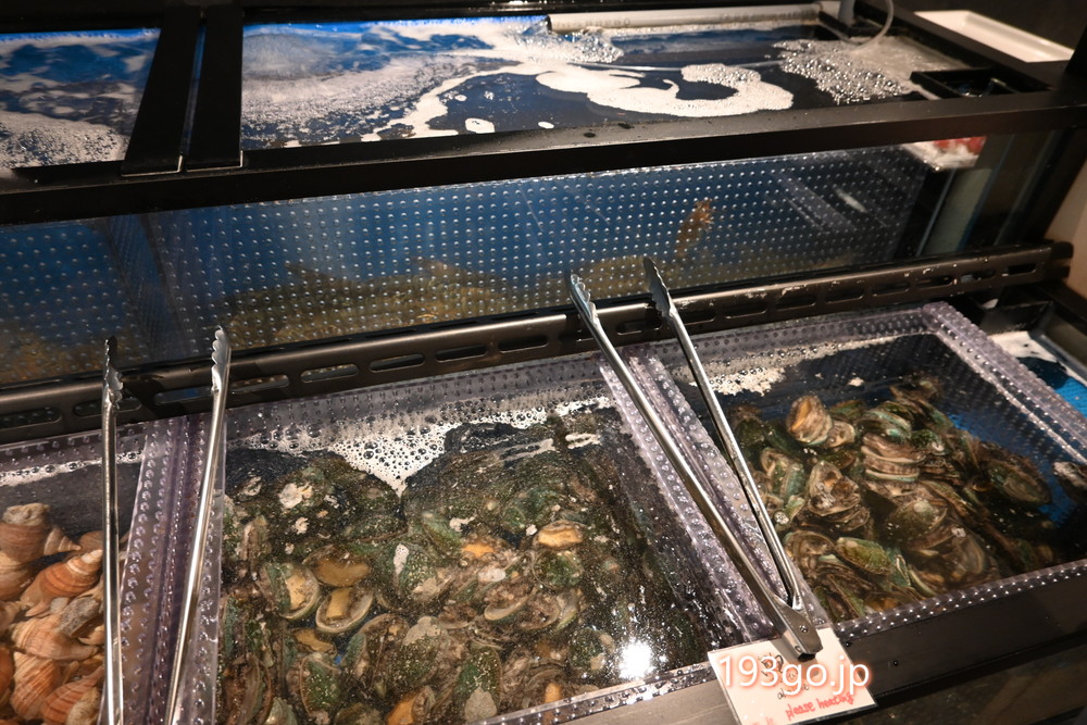 いけすには、鮑やサザエなどの新鮮な魚介類。