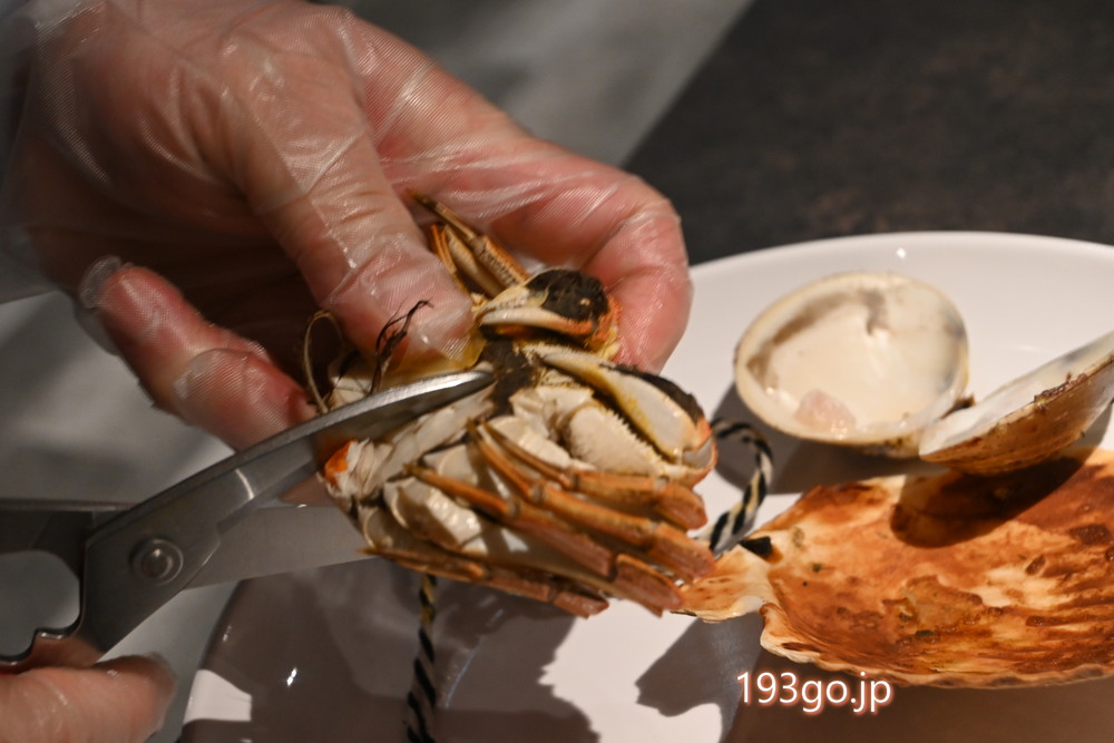 蟹をむくコツを店員さんにレクチャーしてもらい、ハサミを入れたら、気持ち良いくらいにスルーっとむけるように!甘くてしっとりした蟹に夢中に。