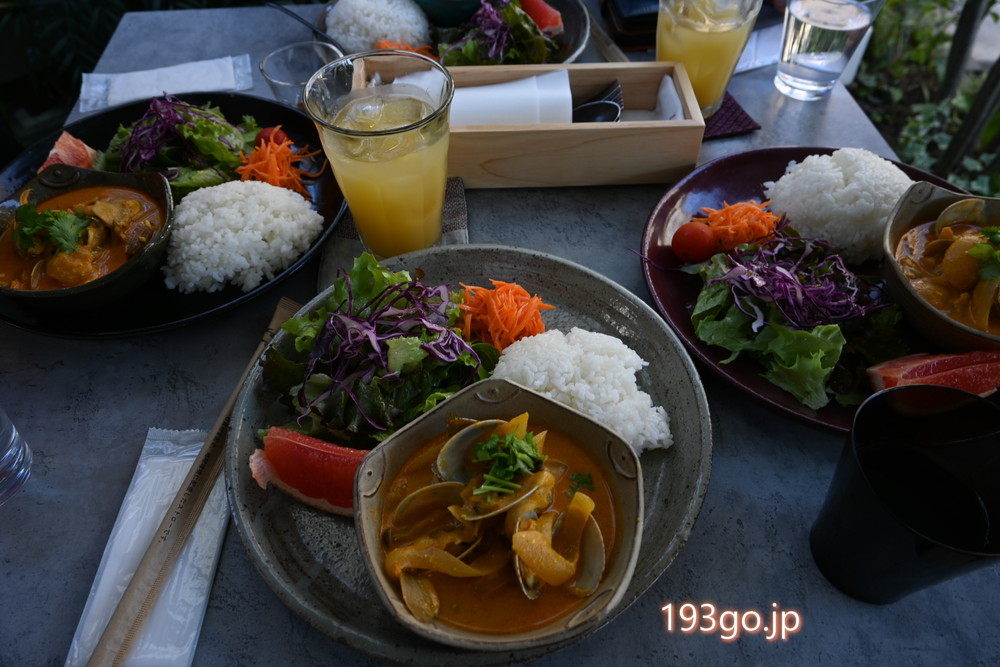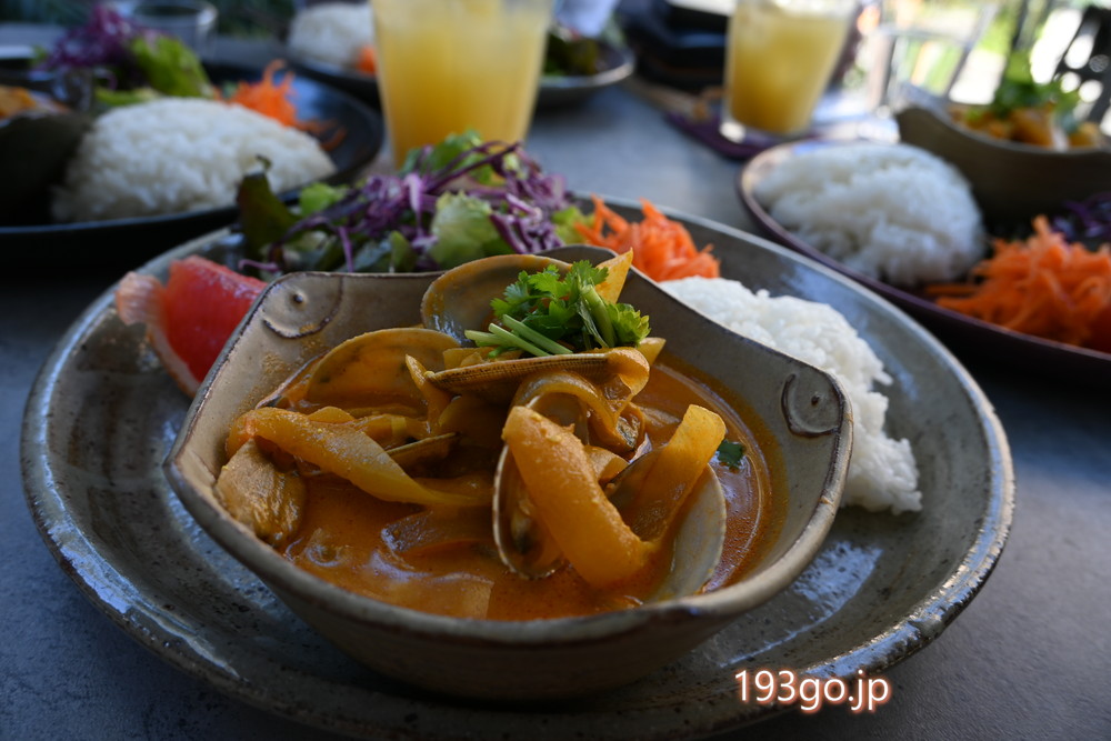 アサリとキノコに玉ねぎやパクチー入り。汁気のあるカレーでご飯も進む~。
