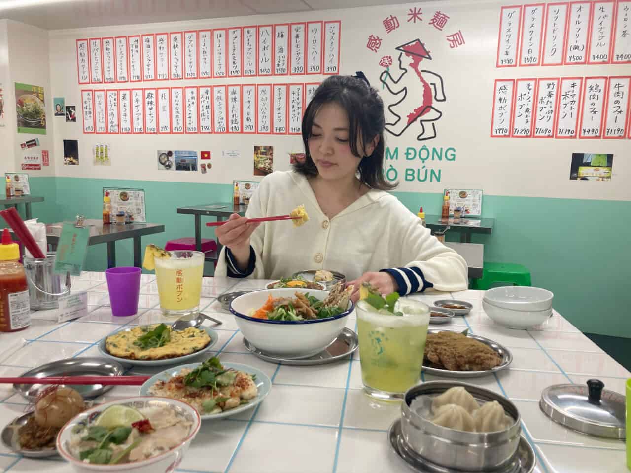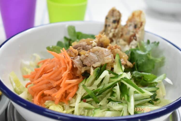 米粉の麺に、もやし、にんじん、キュウリ、ミント、パクチー、ピーナツ、ネム(ベトナム揚げ春巻き)、牛肉などが具だくさんに乗り、どんぶりの底の甘酸っぱいソースと豪快に混ぜ合わせて食べる。