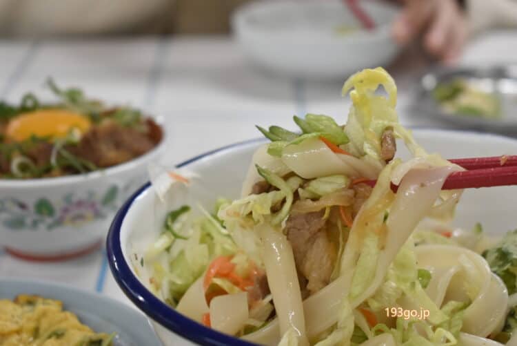 今回はきしめんっぽい米粉の麺で噛み応えがあり、
