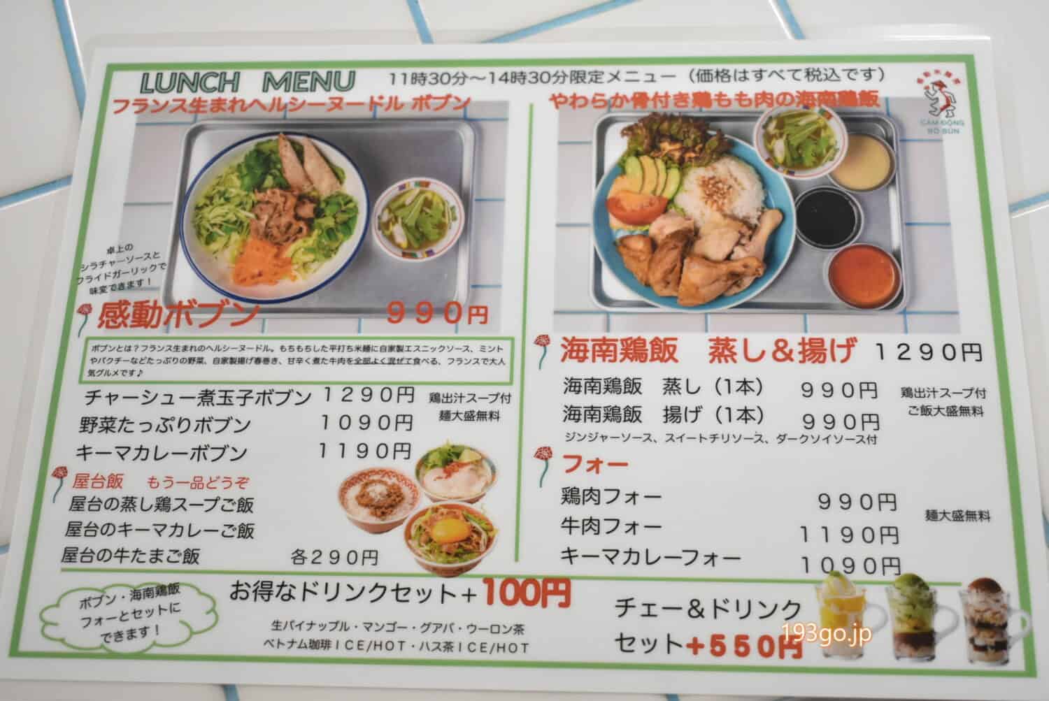 ランチは平日も土日も11:30~14:30で感動ボブン:990円や、海南鶏飯:1290円などがあり!