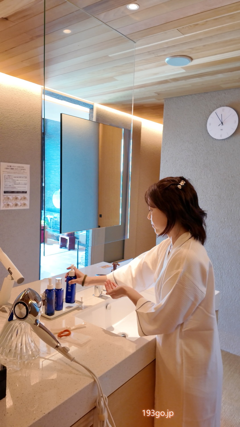 パウダールームにはドライヤーやタオル、ガウン、水、スキンケア用品などが完備。
