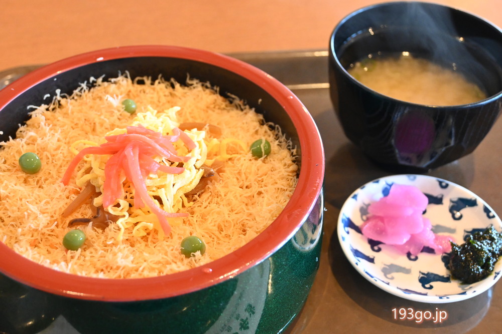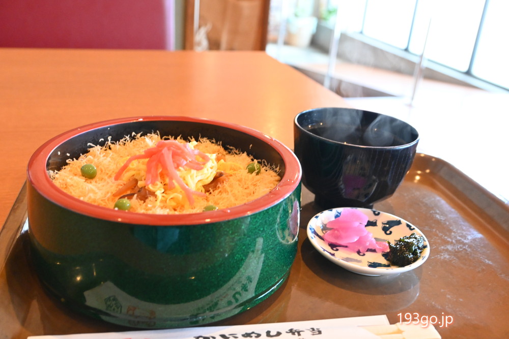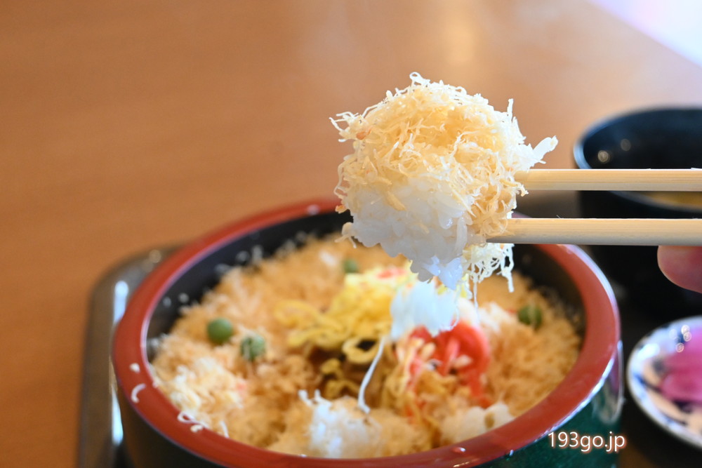 寿司桶に蟹のほぐし身が敷き詰められた蟹飯が来た。錦糸卵やグリンピースがトッピングされ、ちらし寿司風。