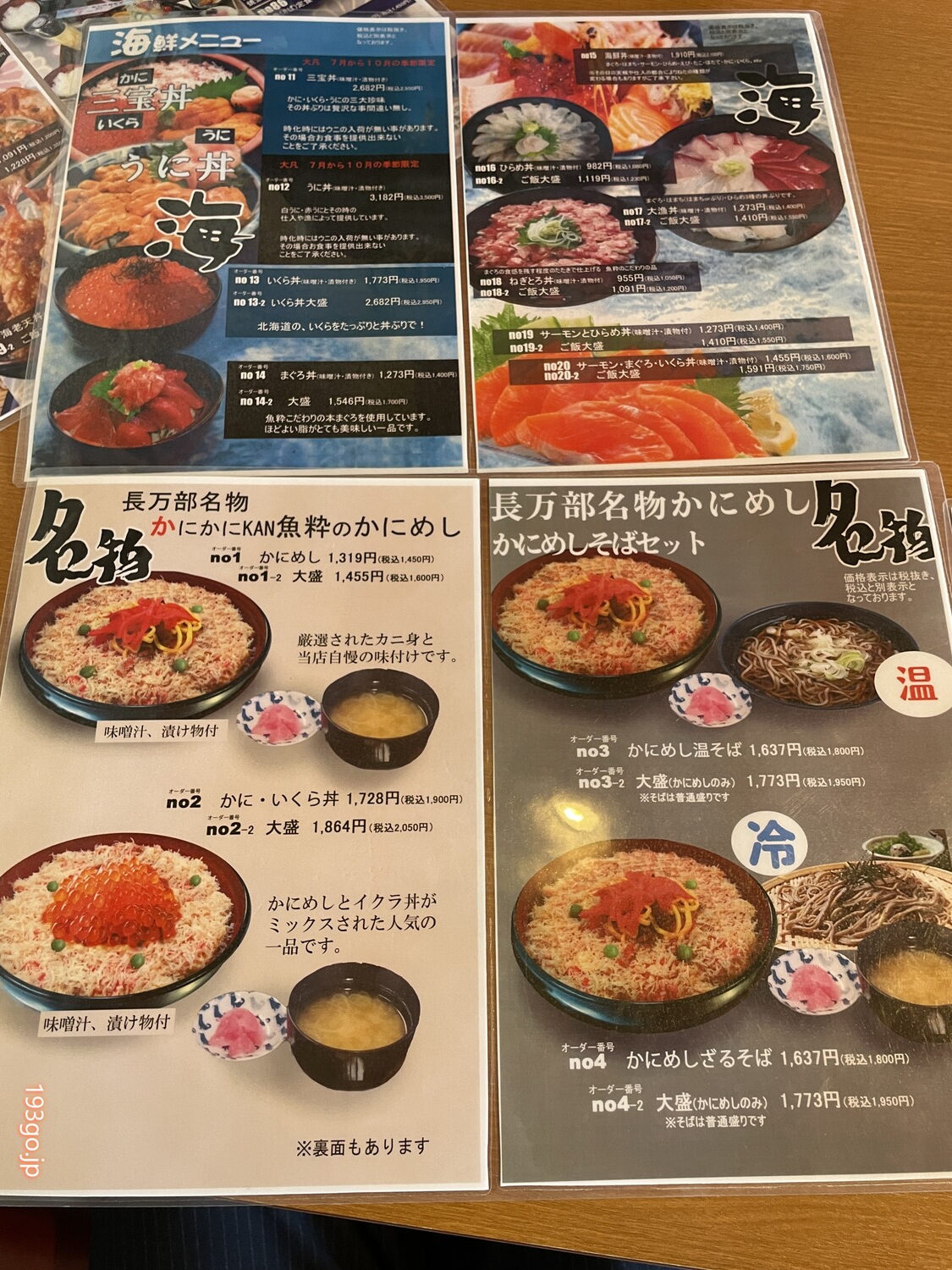 レストランメニューは海鮮丼、天丼、そして蟹飯。どれも盛り具合がよさそう。