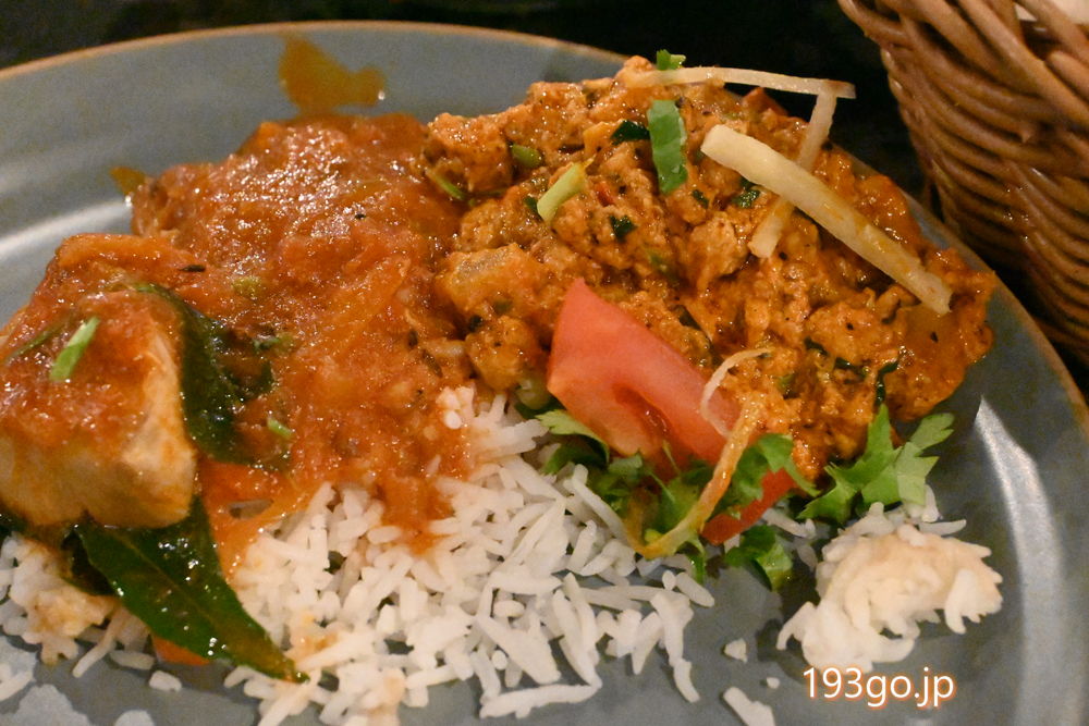 キーマカレーはココナッツの風味が際立ち、フィッシュカレーはトマト仕立て。
