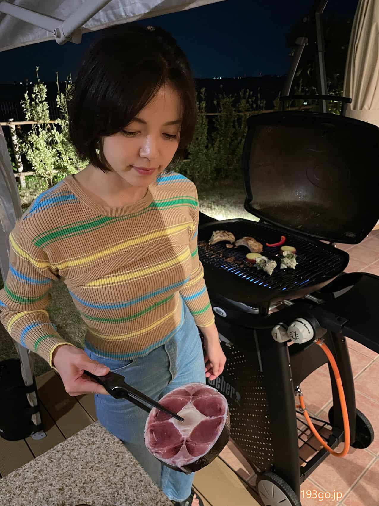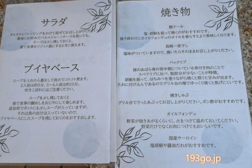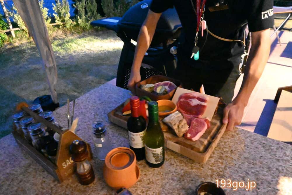 リクエストした夕食の時間(17時前)になると、専用のバーベキュースペース(ウッドデッキ&ガーデン)に食材が運ばれた。