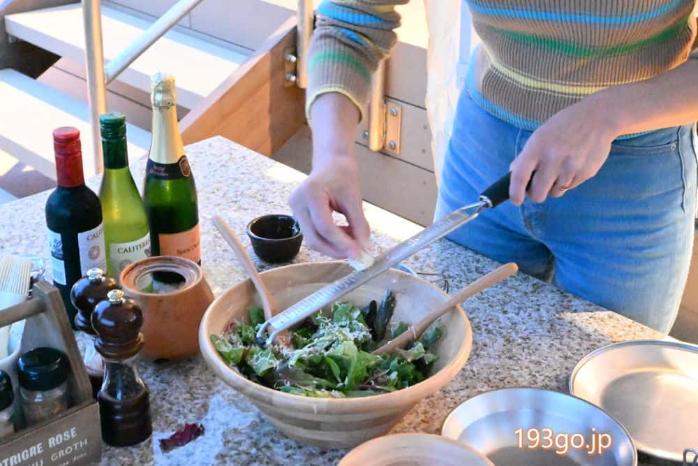 シーザーサラダはパルメザンチーズを削って、ドレッシングで和えていただきます。ボウルに三浦野菜たっぷり。