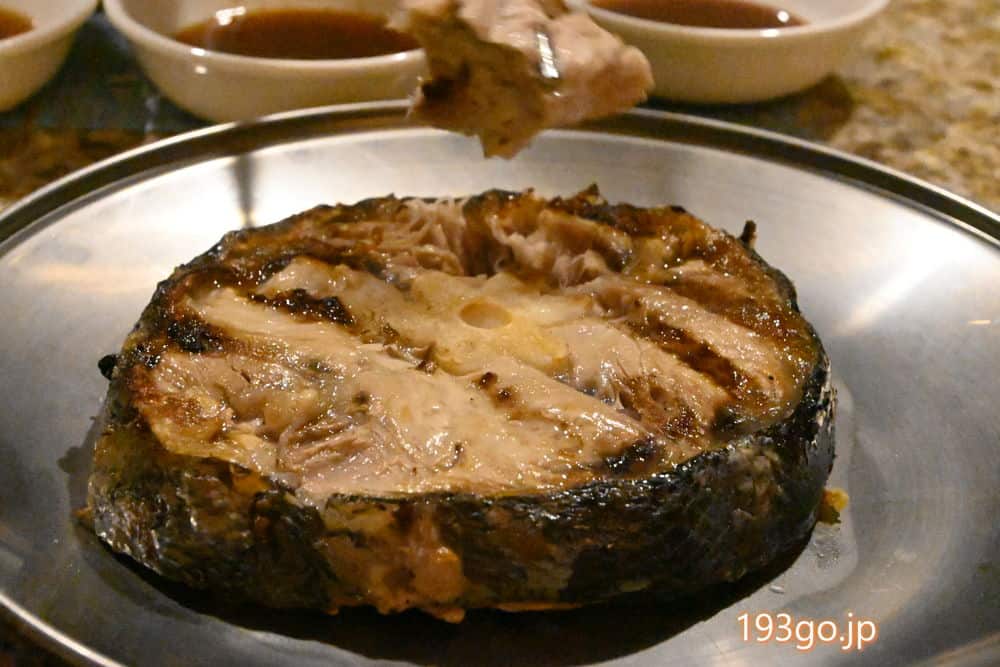 メイン(焼き物)は、鮪テール、イカ一夜干し、バックリブ、オイルフォンデュ、国産サーロイン、国産牛焼きしゃぶしゃぶ、サザエのブルゴーニュ風と、超豪華。