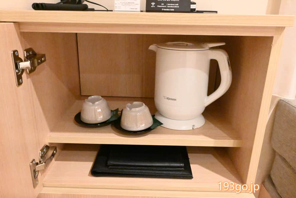シャンプー、コンディショナー、ボディソープ、洗顔ソープ、歯ブラシ・歯磨き粉、パジャマ、スリッパ、バスタオル、フェイスタオル、ミネラルウォーター、電気ケトル、お茶