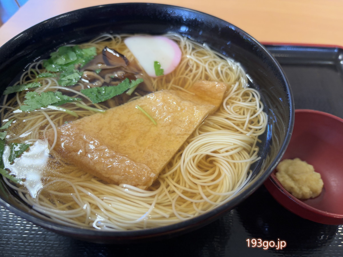 お揚げ、カマボコ、椎茸、三つ葉がトッピング。別添えのおろし生姜を溶いて。