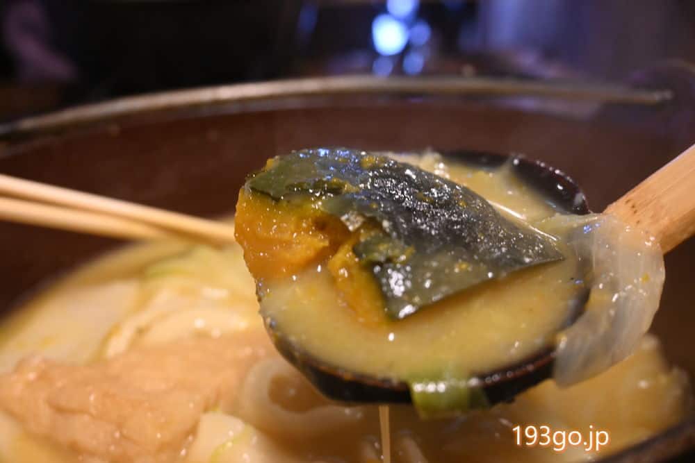 具材はなめこやキャベツ、油揚げ、かぼちゃ。