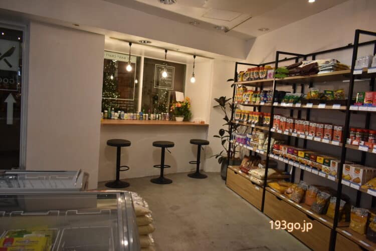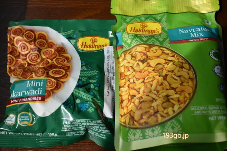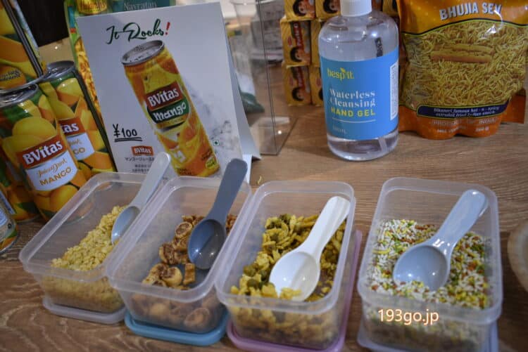 主にインドの調味料やカレーなどの食品が揃い、購入したフード&ドリンクのイートインも可能。味見して美味しかったスナックをゲット