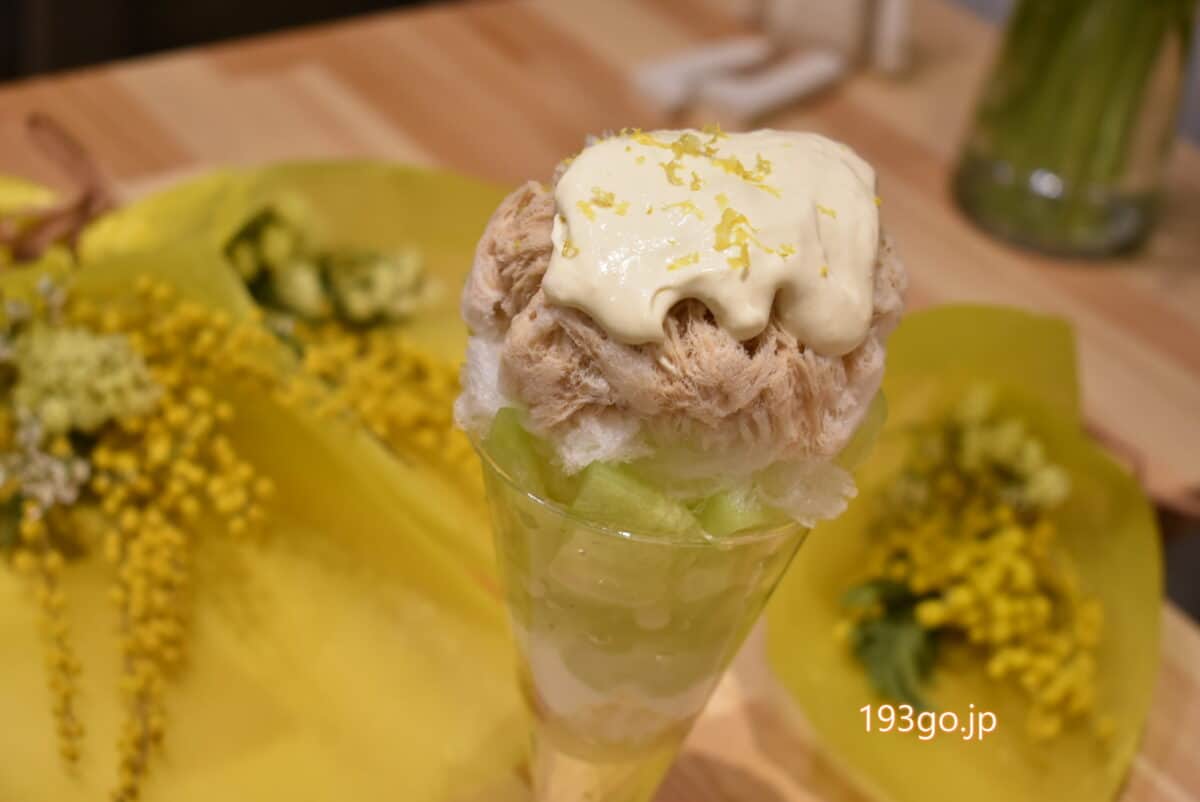 湘南ゴールドピールがトッピングされたふわふわのクリームチーズソースの下はミルクティーかき氷。中にもアールグレイシフォンと紅茶ベースで、甘くジューシーなメロンの果肉やマスカルポーネにオレンジのゼリーなど、スリムだけど沢山の食材が詰まった贅沢なパフェ。