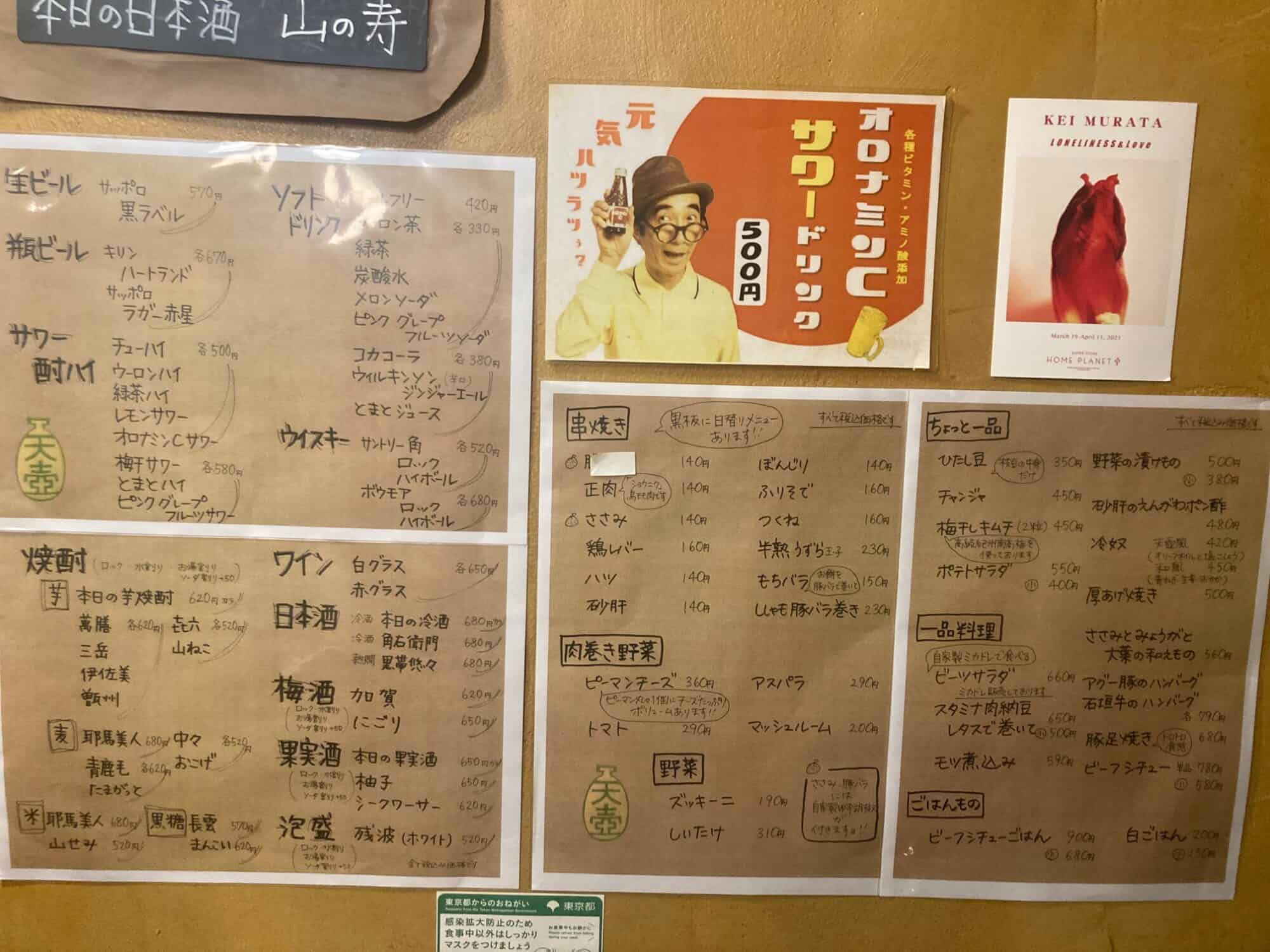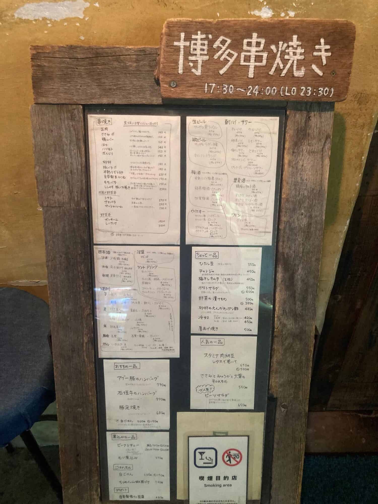 メニュー 串焼き、おつまみ、お酒。種類豊富