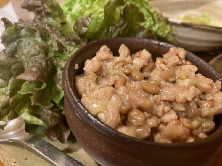 肉納豆をレタスで巻いて食べるスタミナ肉納豆など、