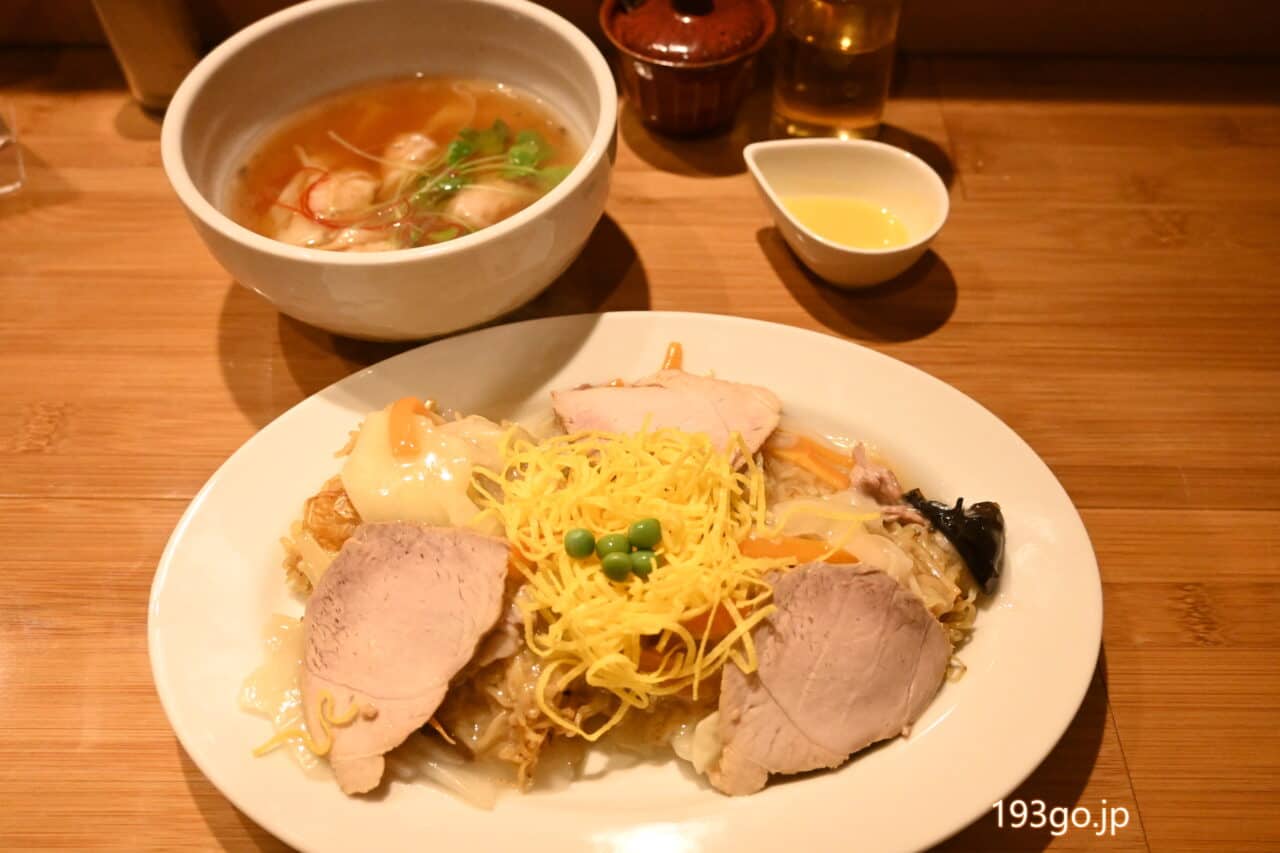 初めて食べるか、それとも食べたことがあるような気もする餡かけ焼きそば。注文した「焼きそば 小わんたんセット 並盛り」が来た。