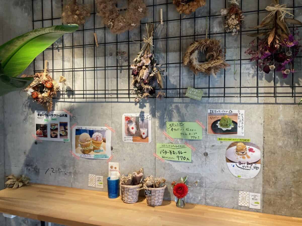 壁に貼られている自家製アイスや季節のフルーツ大福などのスイーツの写真が美味しそう!