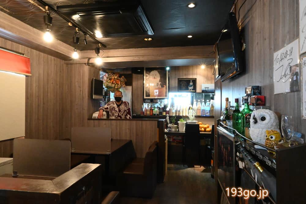 店内は暗めでソファー席、カウンター席。お酒がズラリ。