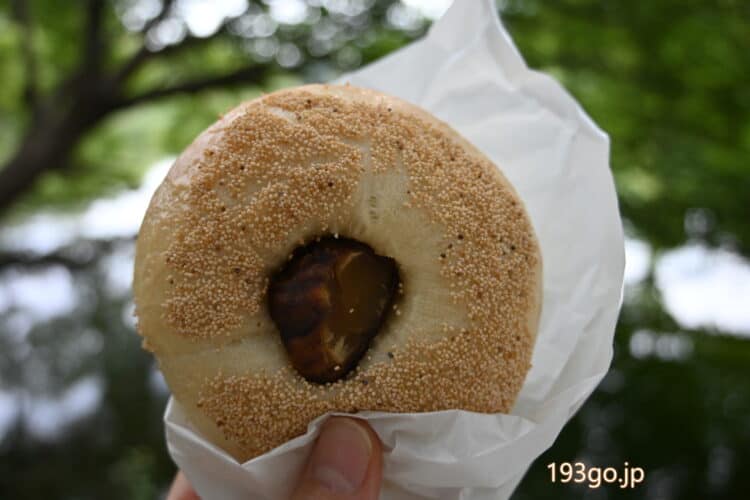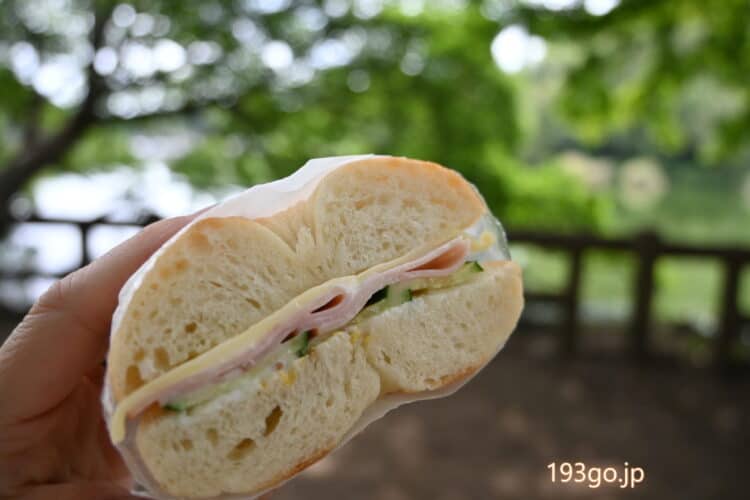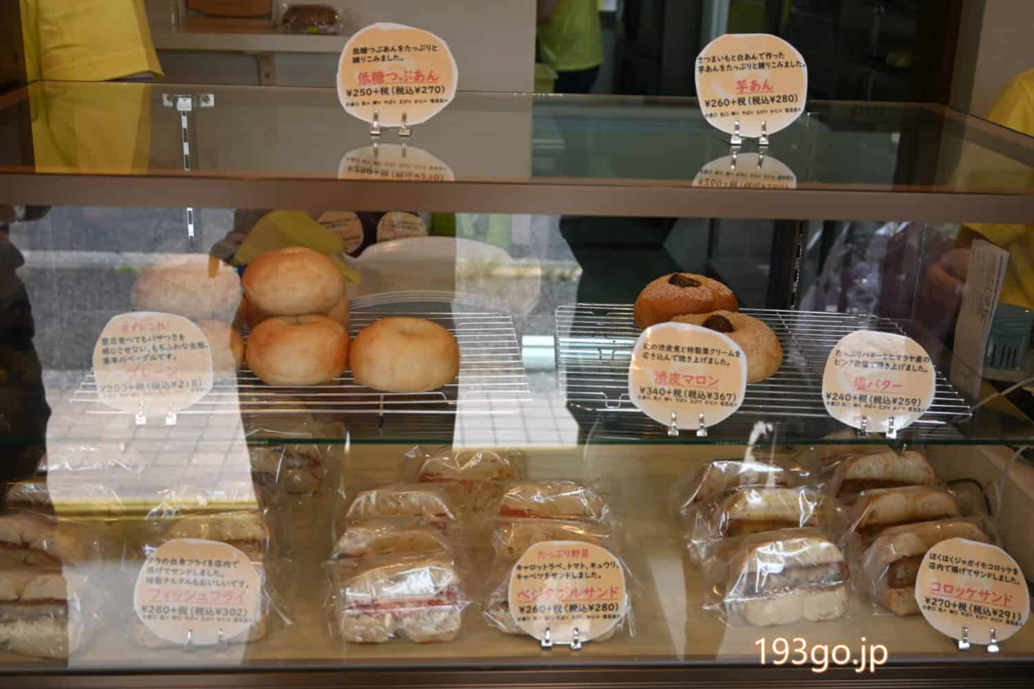 渋皮マロンに塩バター、チョコ、ナイアガラレーズン、低糖ふすまなど丸々したベーグルに、具材がサンドされたベーグルはハーフサイズで、ハムチーズやコロッケ、フィッシュフライなど、全部で15種類ほど並んでいた。